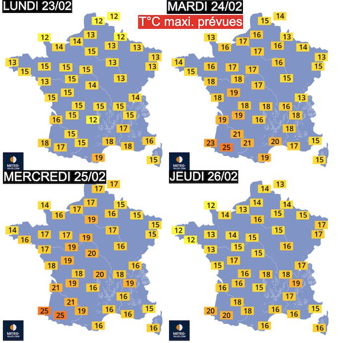 Températures maximales prévues entre lundi 23 et jeudi 26 février selon METEO-VILLES.COM