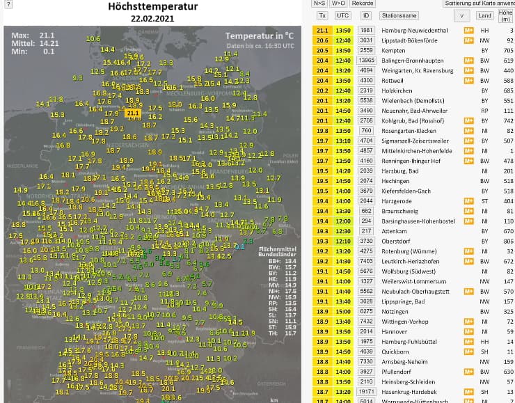 Températures maximales et records de douceur en Allemagne le lundi 22 février 2021 - via WeatherUndergroud