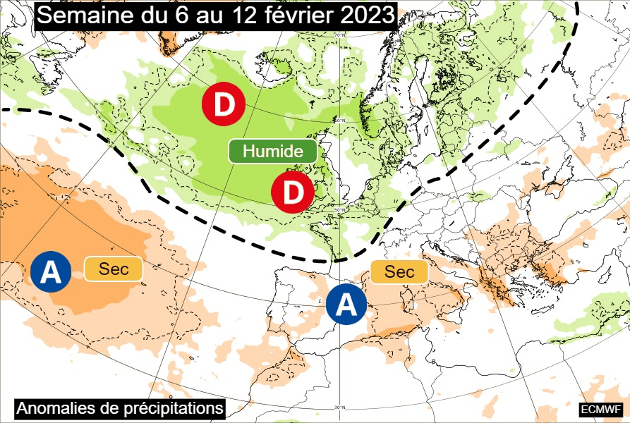Anomalies de précipitations sur l'Europe pour la semaine du 6 au 12 février 2023 - ECMWF