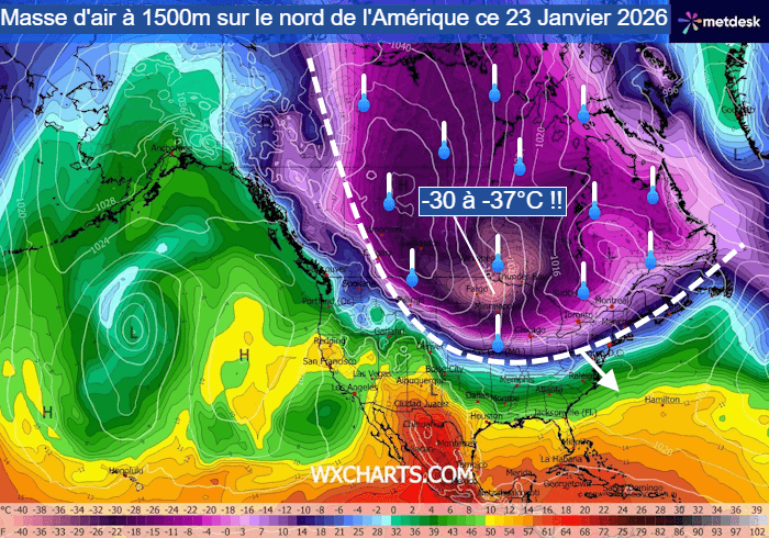 Le décrochage polaire qui intéresse le nord de l'Amérique est massif ! Une nouvelle vague de froid majeure débute de l'autre côté de l'Atlantique et cet air glacial est en train de gagner les États-Unis. Ce vendredi 23 janvier 2026, la température de la masse d'air à 850 hPa (vers 1500m) atteignait -37°C au dessus du Minnesota, des niveaux particulièrement bas et que l'on rencontre plutôt près du pôle ! Au sol, la barre des -30°C est d'ores et déjà franchie dans les États du nord des USA et les ressentis au vent sont encore plus glaciaux !