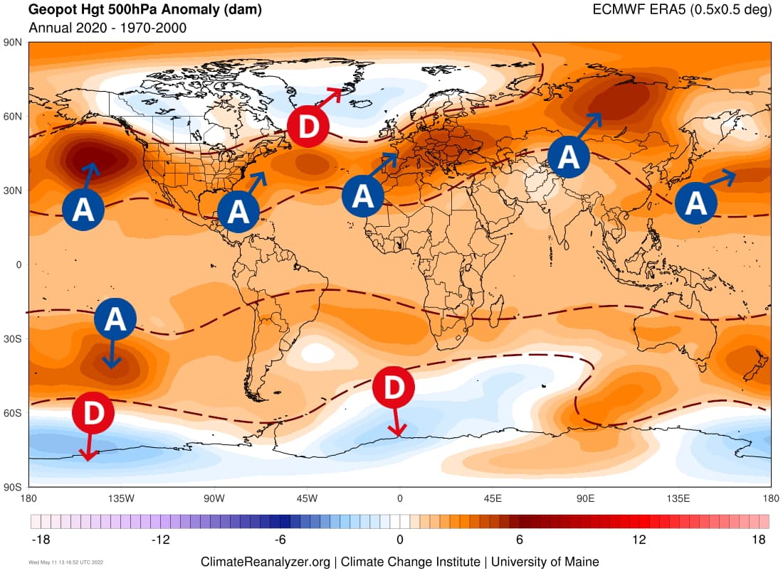 Cela fait plusieurs années que l'on observe une remontée en latitude des ceintures anticycloniques, que ce soit dans l'hémisphère nord ou dans l'hémisphère sud. Comme l'illustre la carte ci-dessous montrant les anomalies de géopotentiels durant l'année 2020, on retrouve une anomalie de hautes pressions du nord du Pacifique à la Sibérie en passant par l'Europe, au nord de la ceinture habituelle de hautes pressions. L'activité dépressionnaire la plus dynamique circule plus près des pôles qu'en temps normal. Cette année 2020 avait d'ailleurs vu le soleil briller 2.102 heures à Paris, un record depuis au moins 1959 ! Cette année là, on avait mesuré 2.251h de soleil mais les capteurs de l'époque surestimaient les valeurs et il est probable que 2020 détienne le record.