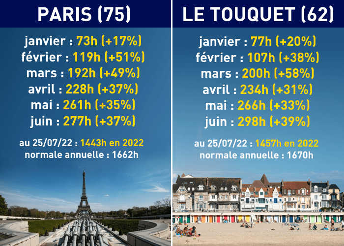Ainsi, de nombreuses régions de la moitié nord ont connu six mois consécutifs plus ensoleillés que la normale et s'apprêtent à en boucler un septième ! Les exemples de Paris ou du Touquet (62) sont marquants avec des excédents d'ensoleillement supérieurs à 30% chaque mois depuis février dernier ! Dans la capitale, on totalisait déjà 1443 heures de soleil en 2022 au 25 juillet 2022. Il ne manque plus que 219h de soleil pour atteindre la normale annuelle alors qu'il reste encore plus de cinq mois dans l'année ! De son côté, Le Touquet n'est plus qu'à 213h d'atteindre sa normale annuelle !