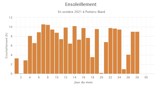 Taux d'ensoleillement quotidien à Poitiers (86) au mois d'octobre 2021 - via infoclimat.fr