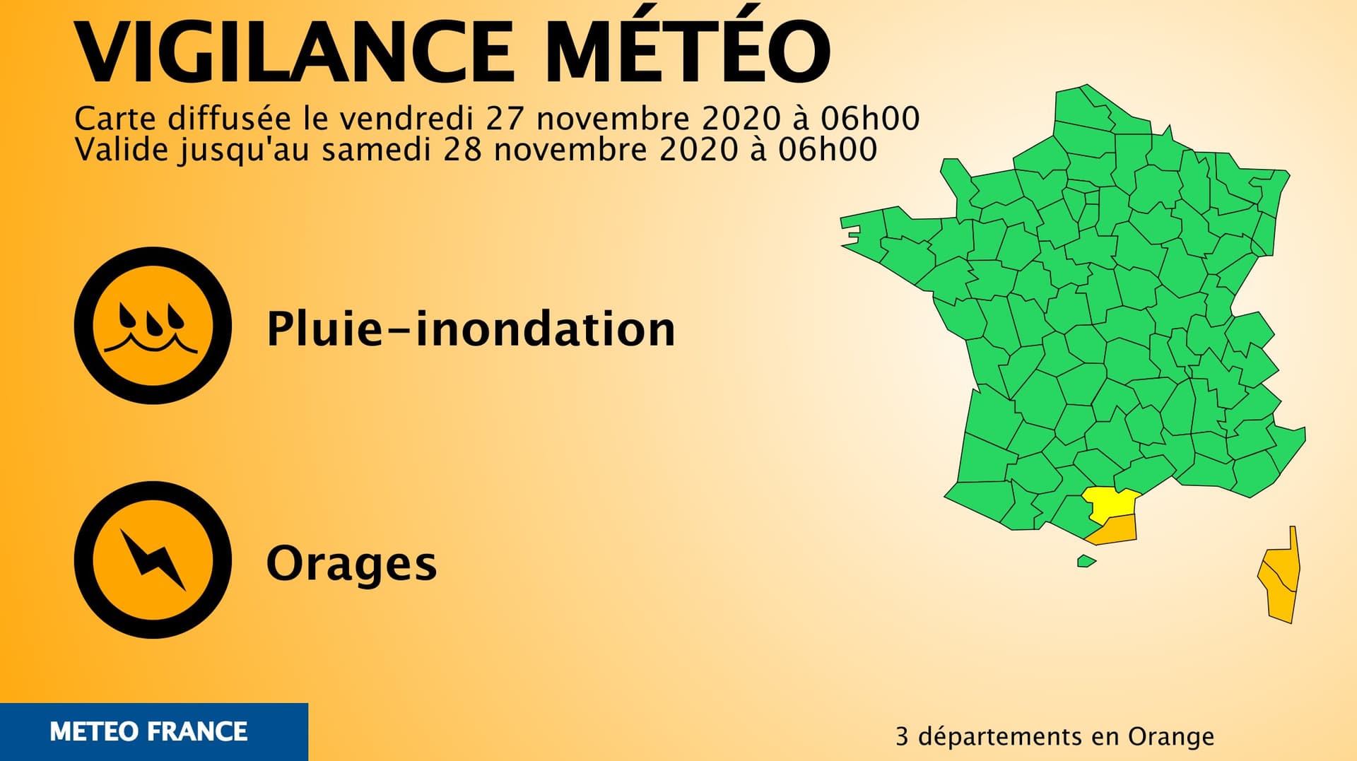 Si cette dépression ne parvient pas a remonter vers le Nord en raison des hautes-pressions restant dominantes sur la France, de fortes pluies orageuses sont tout de même attendues entre la Corse et les Pyrénées-Orientales. Ces départements sont placés à partir de ce soir 22h en vigilance orange Pluies-Inondations/Orages par les services de Météo-France :
