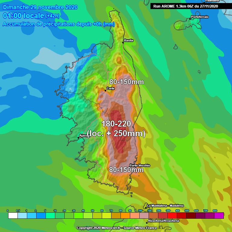 Au total, d’ici Dimanche matin, les cumuls pourront atteindre 180 à 220mm (loc. + de 250mm) sur les contreforts Est des reliefs Corses, notamment du Sud de Corte à Quenza, parfois 80 à 150mm sur le piémont et les plaines intérieures et entre 40 et 70mm en général sur la bande littorale, possiblement un peu plus sur le littoral Sud (région de Porto-Vecchio/Solenzara).