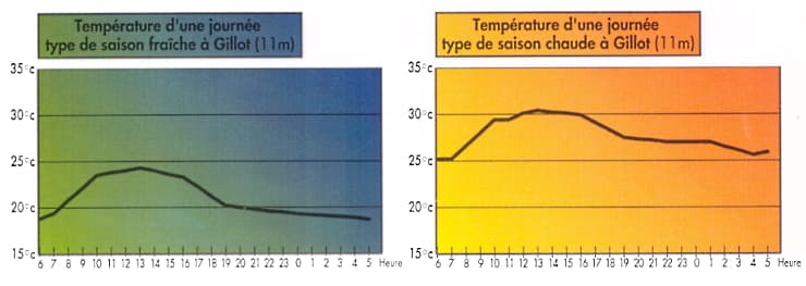 Comme l'illustre les graphiques ci-dessus valables pour l'aéroport de La Réunion Roland-Garros (localement appelé Gillot), le climat réunionnais se caractérise aussi par de faibles variations thermiques au cours de la journée. En moyenne, il n'y a que 5 à 7°C d'écart entre le matin et l'après-midi, à la saison chaude comme à la saison "fraîche". C'est en début d'après-midi qu'est généralement atteinte la température maximale de la journée (vers 13h). La minimale, quant à elle, est atteinte à l'aube.