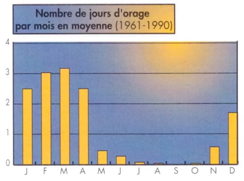 Moyenne des jours d'orages par mois à la Réunion - via Météo France / Météo Villes