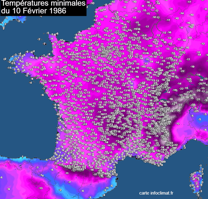 Températures minimales mesurées en France le 10 février 1986 - infoclimat.fr