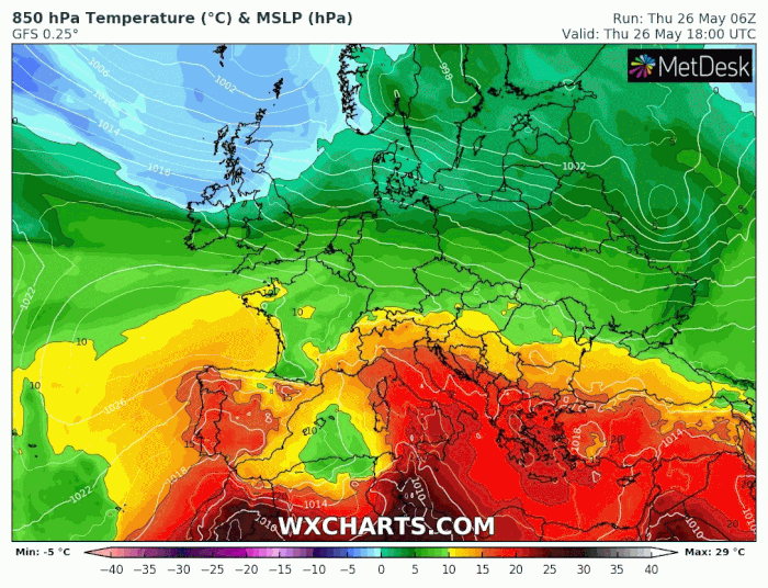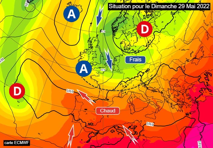 En cette fin de mois de mai, l'anticyclone jusqu'alors situé sur le proche-Atlantique va s'étendre vers le nord de l'Atlantique et le Groenland, continuant d'influencer les Îles Britanniques et la France. Dans le même temps, une vaste zone dépressionnaire s'étale sur la Scandinavie en débordant jusqu'au nord de l'Allemagne. Par conséquent, la France vont se retrouver en flux de nord à nord-est, advectant une masse d'air frais et des nuages. Glissant de l'Allemagne vers l'Angleterre, cet air frais touchera moins le tiers sud de l'hexagone.
