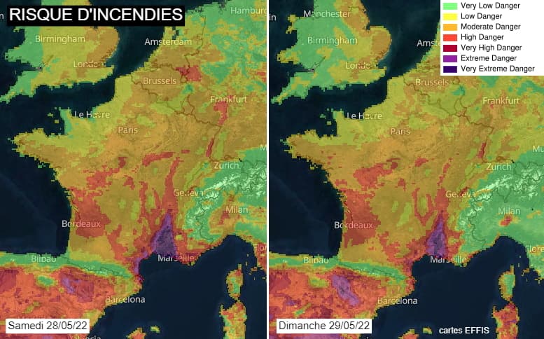 Notons que l'infiltration de cet air frais sur la France va conduire au renforcement du mistral et de la tramontane en cette fin de semaine. Des rafales atteignent 60 à 80 km/h sont prévues dans leurs domaines respectifs. Dans un contexte de sécheresse importante, ces vents forts vont engendrer un risque d'incendies très sévère, atteignant le niveau "extrême" en basse vallée du Rhône ce week-end des 28 et 29 mai 2022. La situation est à surveiller de près et la prudence est de mise dans ces régions.