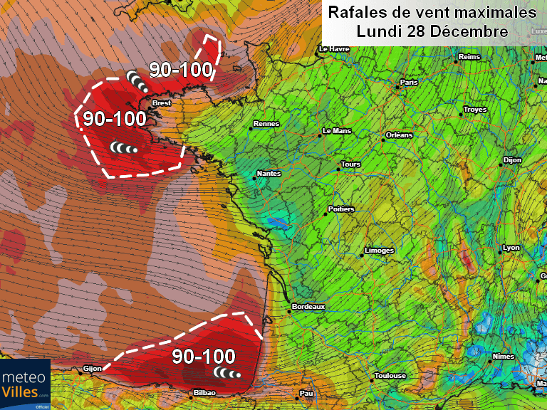 Rafales de vent maximales prévues en journée du lundi 28 décembre – Modèle Arpège via météociel.fr