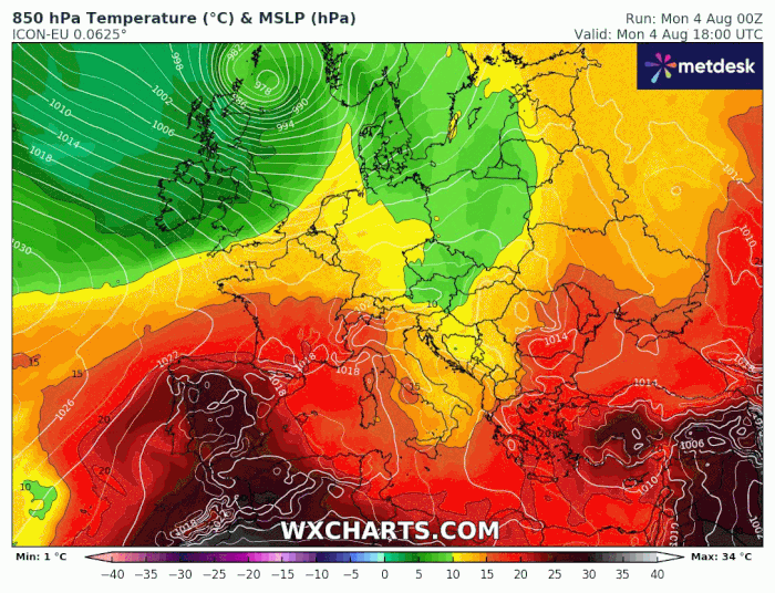 Masse d'air à 850 hPa (vers 1500m) du lundi 4 au mercredi 6 août 2025 - wxcharts.com