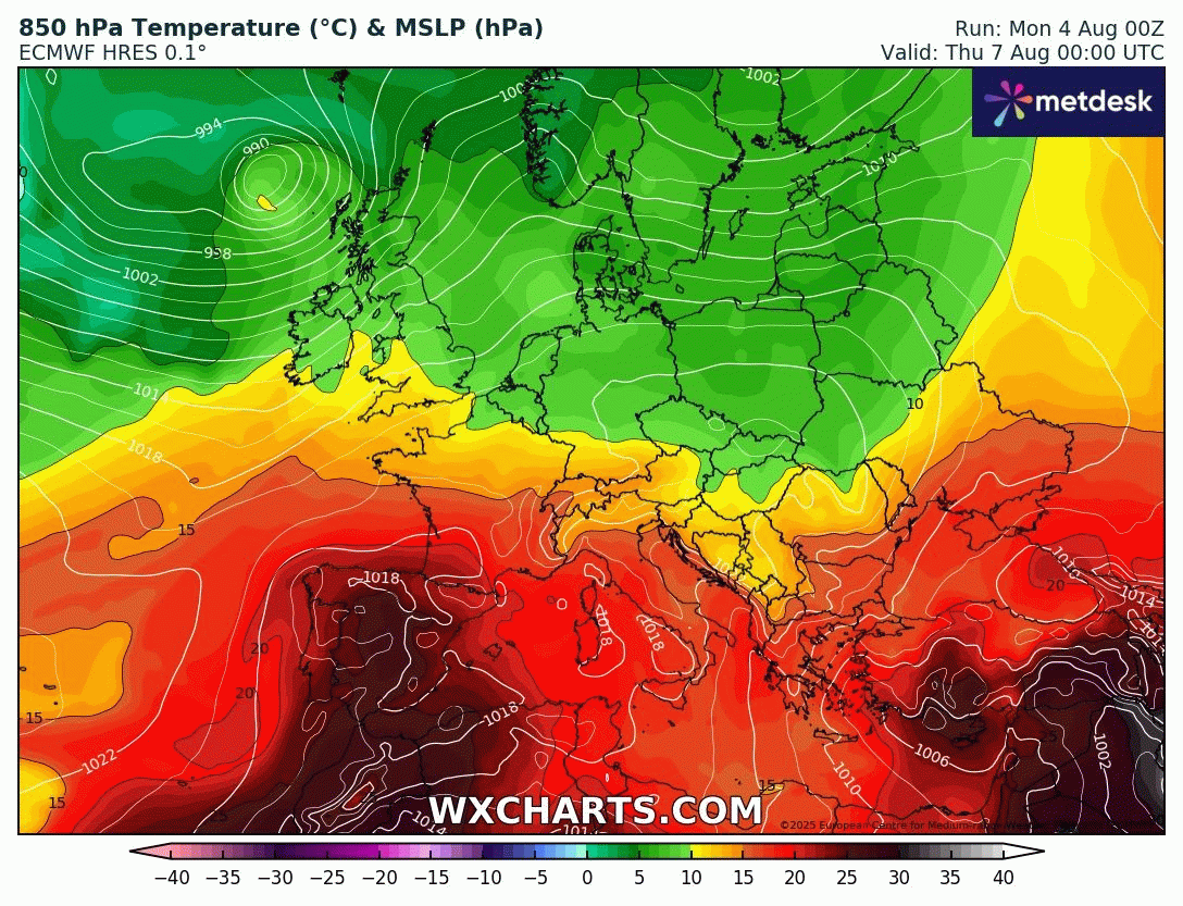Masse d'air à 850 hPa (vers 1500m) du jeudi 7 au dimanche 10 août 2025 - wxcharts.com
