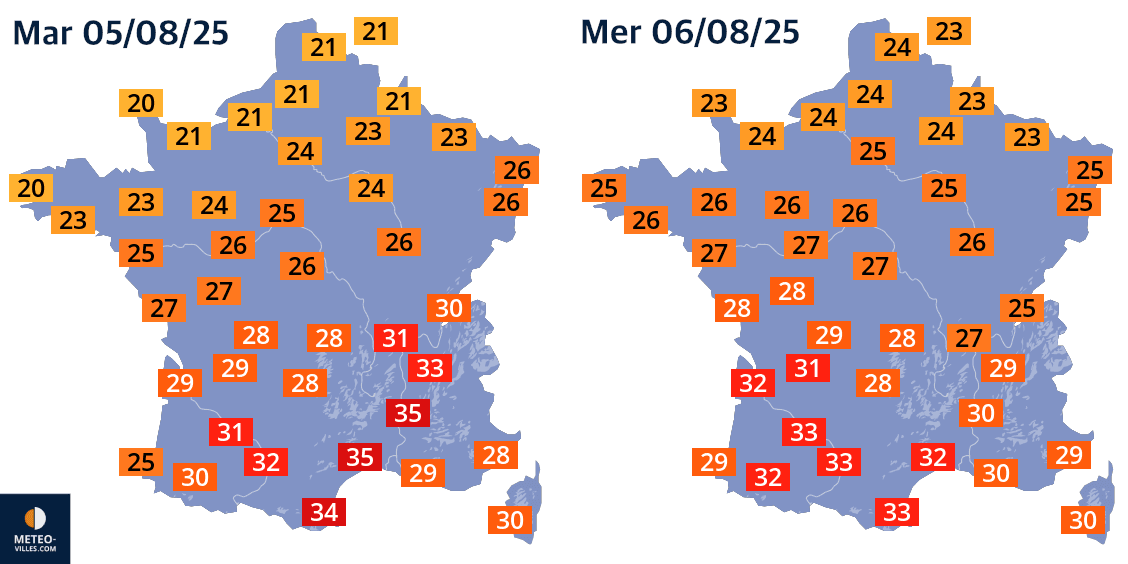 Températures maximales prévues les mardi 5 et mercredi 6 août 2025 - Météo Villes
