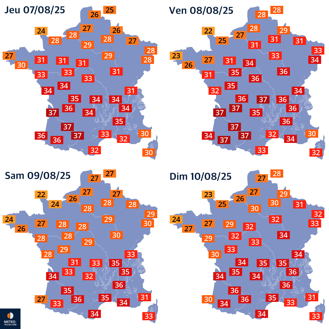 Températures maximales prévues du jeudi 7 au dimanche 10 août 2025 - Météo Villes