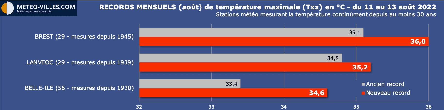 D'autres records, mensuels cette fois, étaient aussi à noter entre les 11 et 13 août du côté de la Bretagne. A Brest, il a été mesuré 36.0°C ce 13 août, la 2e valeur la plus élevée jamais mesurée sur cette station depuis sont ouverture en 1945... après le record historique de 39.3°C du 18 juillet !