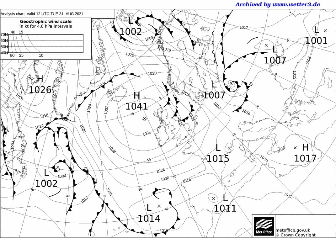 Pressions atmosphériques et isobares sur le Nord de l'Europe le 31 août 2021 – via wetter3.de