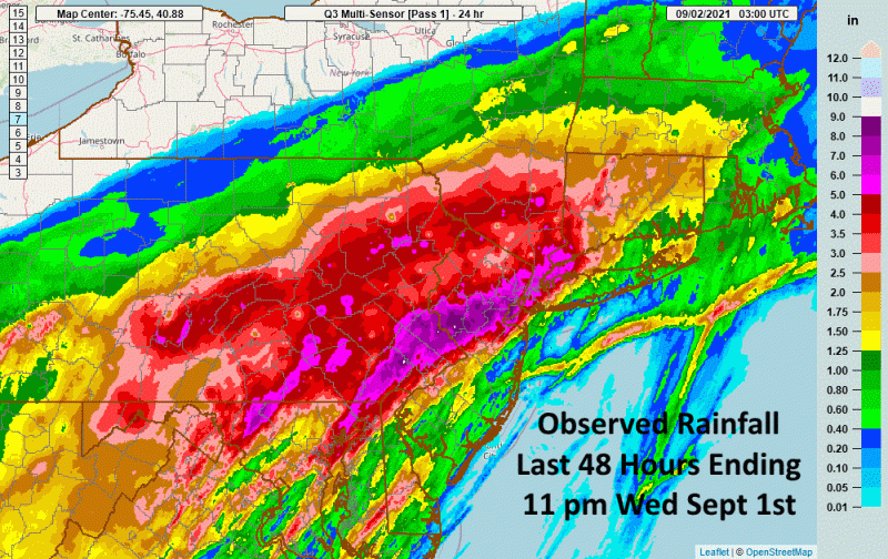Cumuls de pluie relevés en 48h sur le Nord-Est des États-Unis entre le 31 août et le 1er septembre 2021 (1 inch = 24.4mm) – SPC