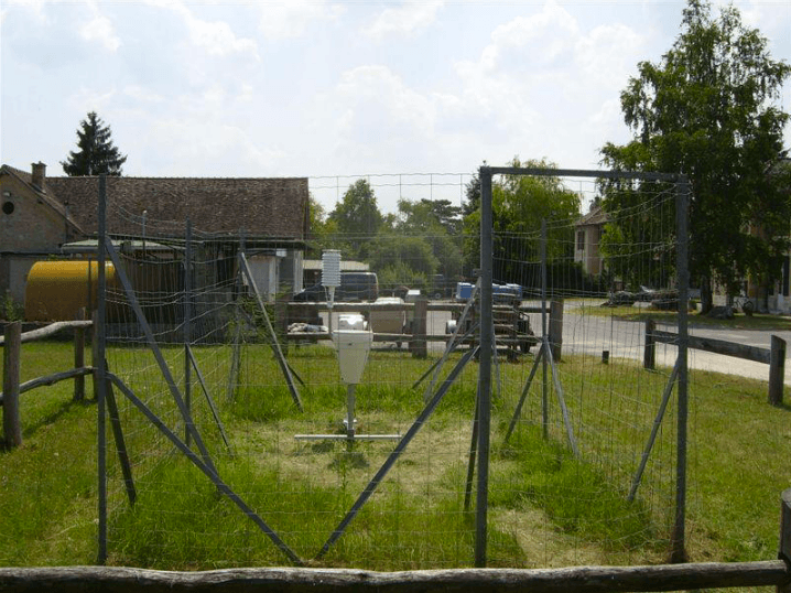 - Le thermomètre et son abri doivent être installé dans un environnement le plus dégagé possible car les obstacles se trouvant autour de l’abri influent sur la mesure. En effet, un abri installé près d’un obstacle vertical (arbre, bâtiment…) risque d’être « protégé » du rayonnement solaire ou du refroidissement radiatif nocturne de l’air, risquant alors de provoquer une surchauffe ou inversement.