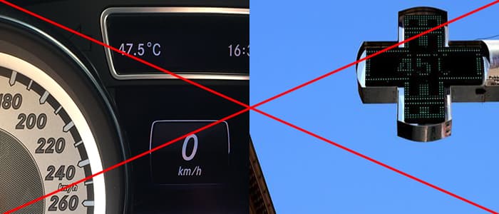Et pour rappel, les relevés de votre thermomètre de voiture ou bien de la pharmacie proche de chez vous sont à BANNIR car souvent mesurés dans des conditions extrêmes, en plein soleil ! S'ils peuvent donner une idée des conditions, ils ne respectent en général aucune norme stricte, et les écarts peuvent dépasser plusieurs degrés.