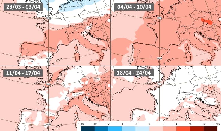 En ce qui concerne les températures, le modèle européen modélise un début avril frais sur le nord de la France mais plus doux au sud. L'anomalie douce se généraliserait pour la semaine du 4 au 10 avril avant une seconde quinzaine du mois sans signaux particuliers.