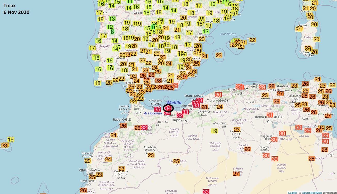Températures maximales relevés entre le Nord du Maroc et de l'Algérie et le Sud de l'Espagne le 6 Novembre - Via ogimet.com