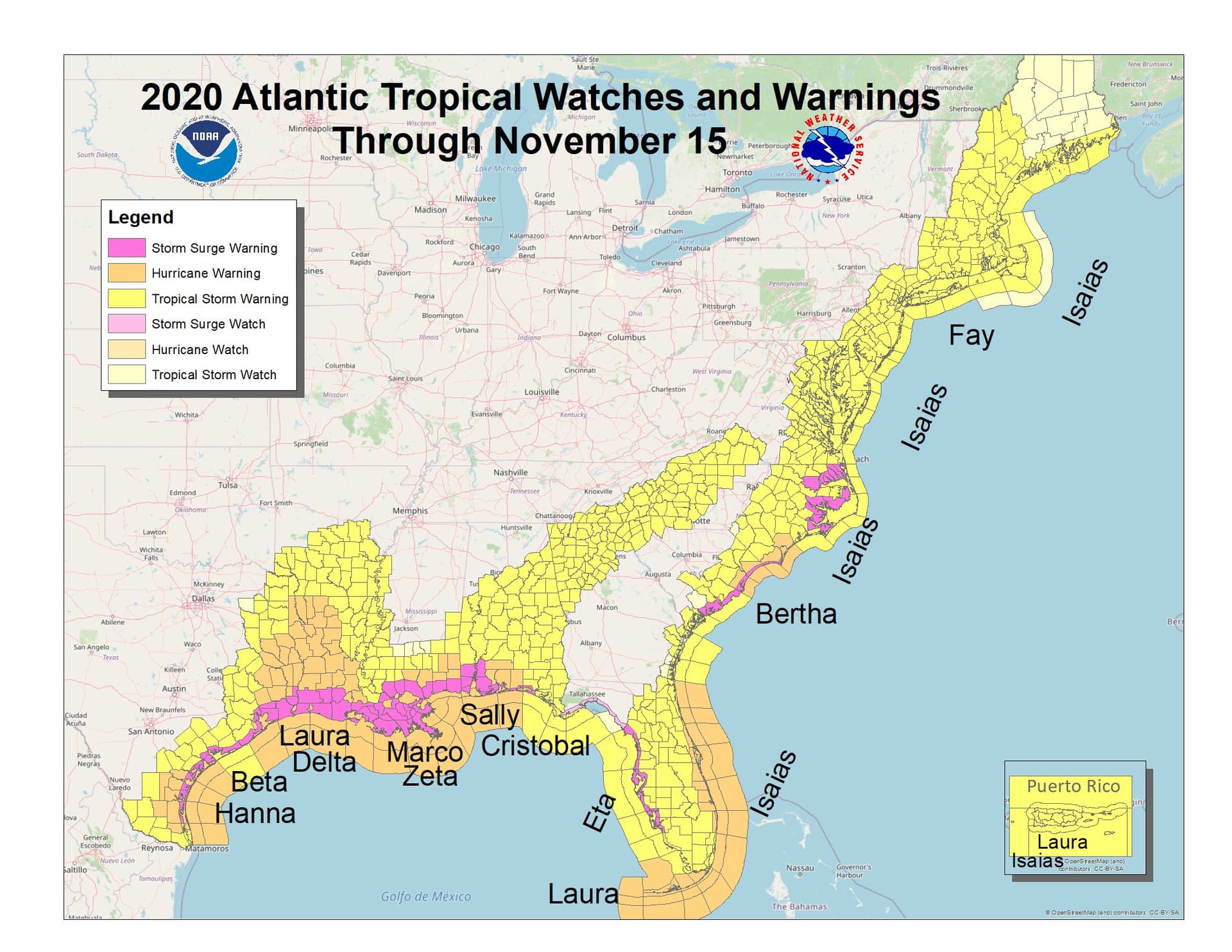 Superposition des alertes cycloniques durant la saison 2020 aux Etats-Unis - via National Weather Service