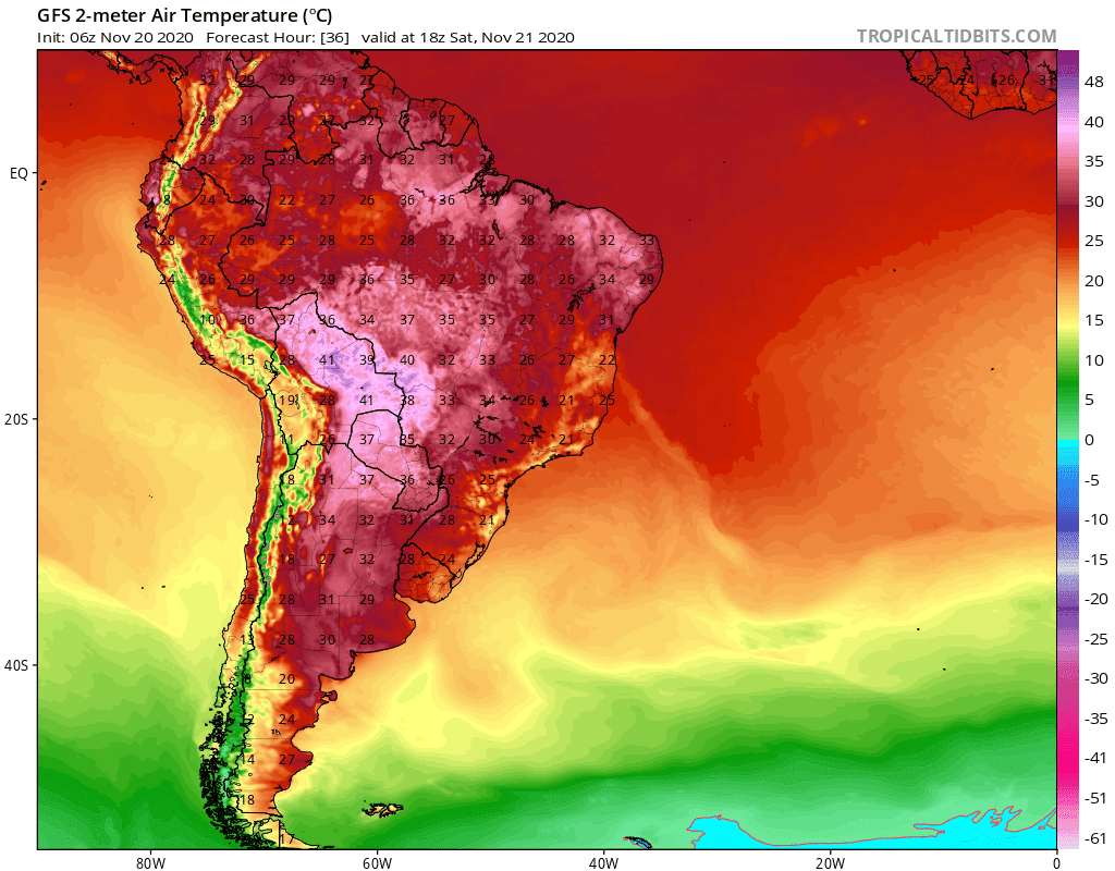 Températures maximales prévues sur le Sud du continent américain en journée du 21 novembre - via tropicaltidbits.com