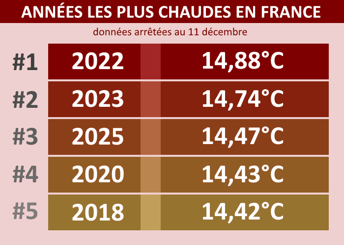 Top 5 des années les plus chaudes en France, au 1er janvier au 11 décembre - Météo Villes, données infoclimat.fr