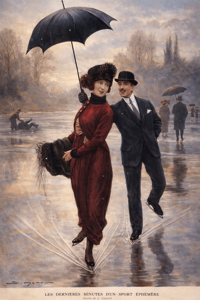 Début février, le froid s’atténue, mais les étangs restent gelés quelques jours encore.  Le patinage devient alors périlleux, la glace s’affinant et risquant de céder.  Les accidents étaient fréquents à cette période, surtout après les vagues de froid.