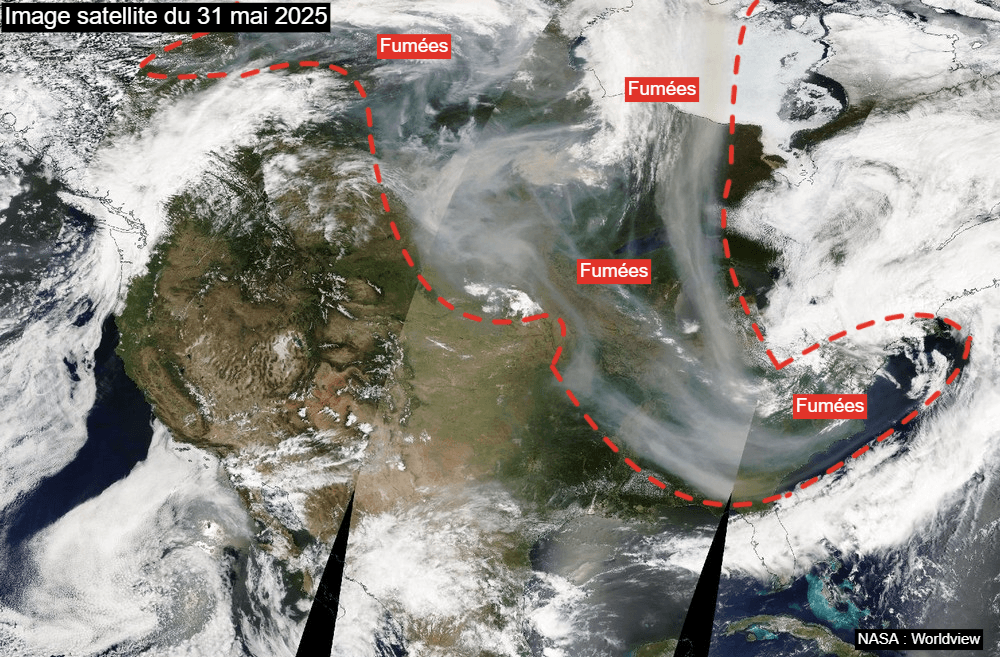 Avec le flux d'altitude, une partie de cet imposant panache de fumées a survolé l'Atlantique et s'est dirigé vers l'Europe en fin de semaine dernière, atteignant notre continent et donc la France ce dimanche 1er juin 2025.