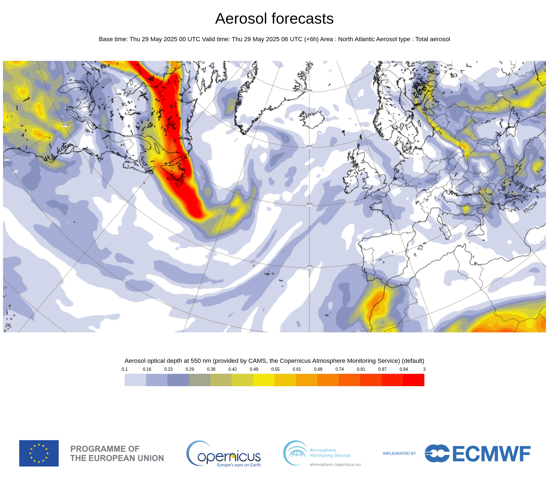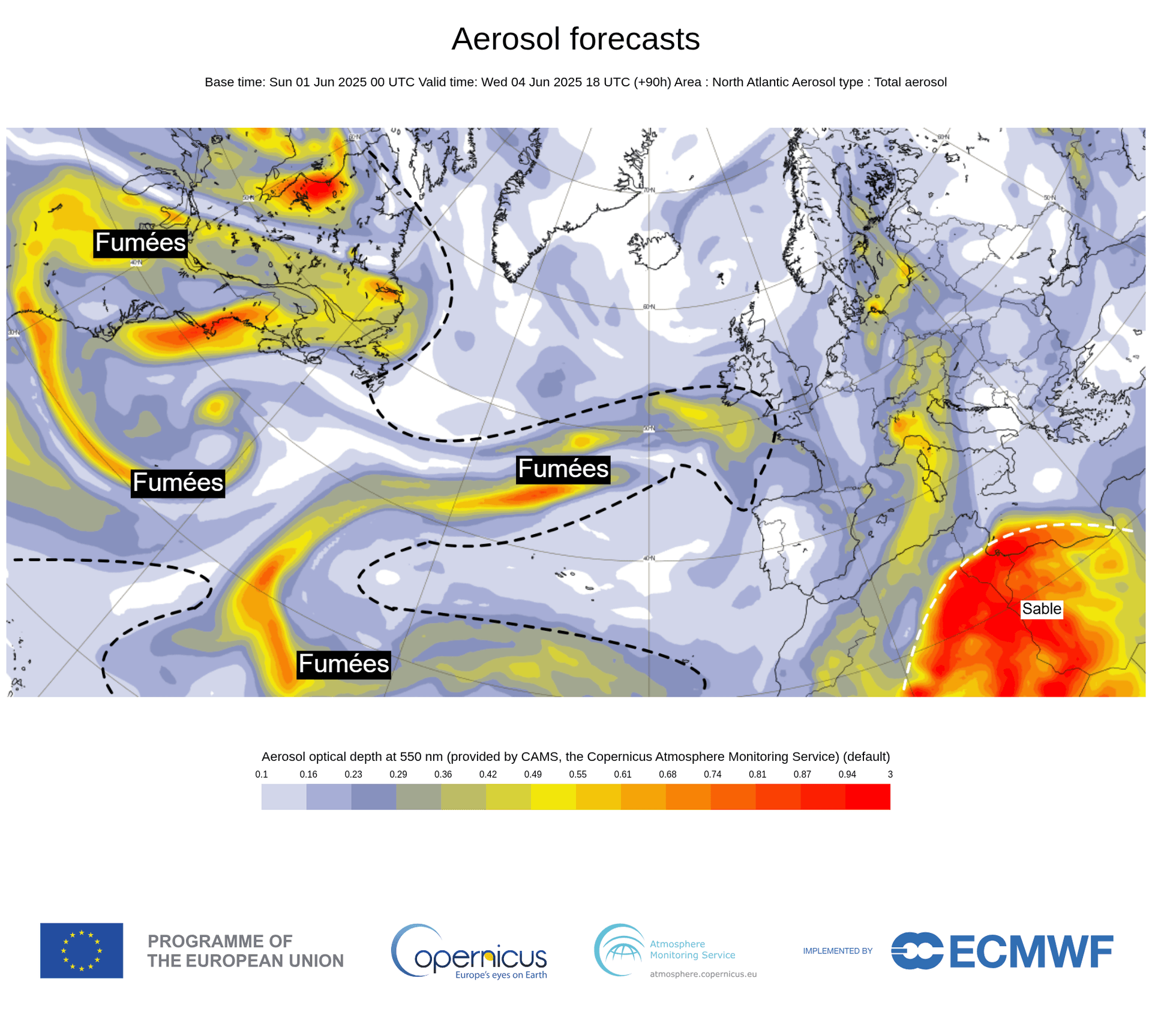Prévision des aérosols au-dessus de l'Atlantique pour le mercredi 4 juin 2025- Copernicus