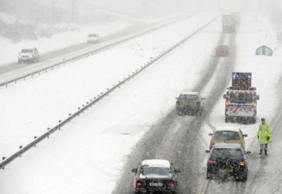 Un policier et des voitures en difficulté sur l'A31près de Thionville le 20 décembre 2010 – Photographie : AFP Jean-Christophe Verhaegen via liberation.fr