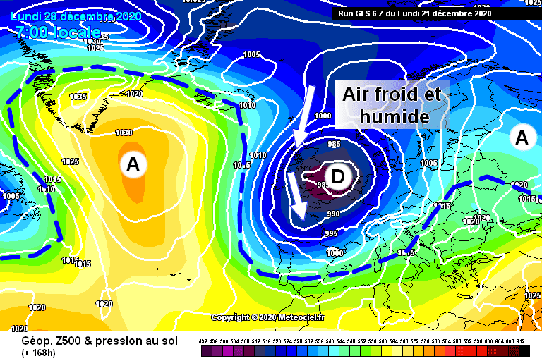 Schéma de la situation atmosphérique pour le lundi 28 décembre 2020 – Modèle GFS via météociel .fr