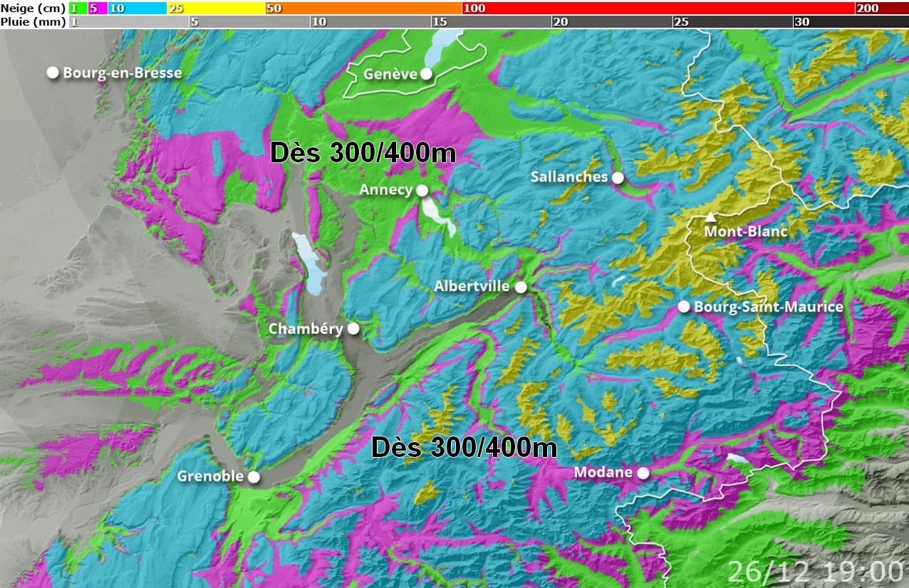 Sur le Nord des Alpes, la neige pourra être observée dès 300/400m d’altitude, notamment en fin de journée du 25 décembre et cours de nuit suivante. Une couche de neige pourrait se déposer jusqu’à Genève et Annecy, ne dépassant pas 1 à 3cm sur ces zones. Dès 500m d’altitude les 10cm pourront être dépassés sur la période, plus de 20cm au-dessus de 1000m.