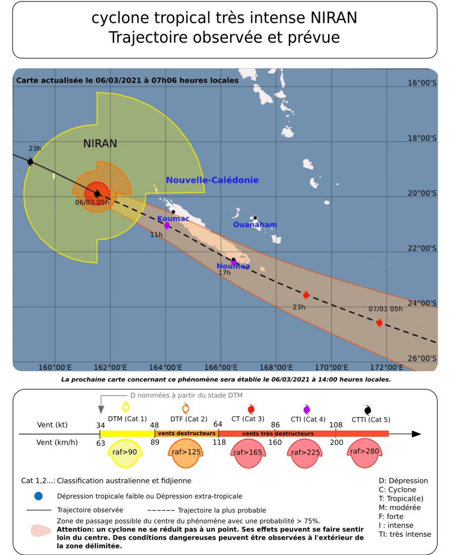 Le cyclone Niran s'est formé ces derniers jours au Nord-Est de l'Australie et se dirige actuellement vers la Nouvelle-Calédonie. Celui-ci longe la zone en cours de journée de samedi (entre 1h et 11h, heure de Paris) et entre 11h et 20h (heure de Nouméa)- son œil circulant à peine au large du littoral Sud de l'île.