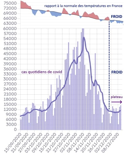 Là où le parallèle entre températures et circulation du virus est intéressant, c'est que l'arrivée de températures froides et hivernales à la toute fin du mois de novembre semble avoir eu un impact négatif sur la baisse du nombre de cas de covid-19. On constate en effet que le coup de froid des derniers jours a enrayé la baisse du nombre de cas avec l'observation d'un plateau (ni augmentation, ni diminution). Il faut toutefois rester prudent sur les origines climatiques car l'allègement du confinement joue probablement aussi un rôle dans cette tendance négative.
