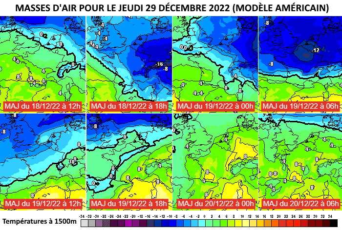Masses d'air à 850 hPa (vers 1500m) le 29 décembre 2022 selon les 8 dernières MAJ du modèle américain - via meteociel.fr