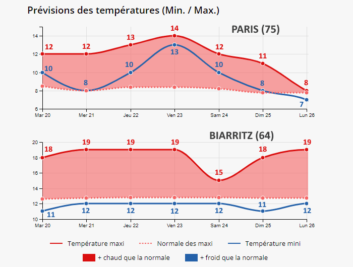 Prévisions des températures à Paris et Biarritz du mardi 20 au lundi 26 décembre 2022 - Météo Villes