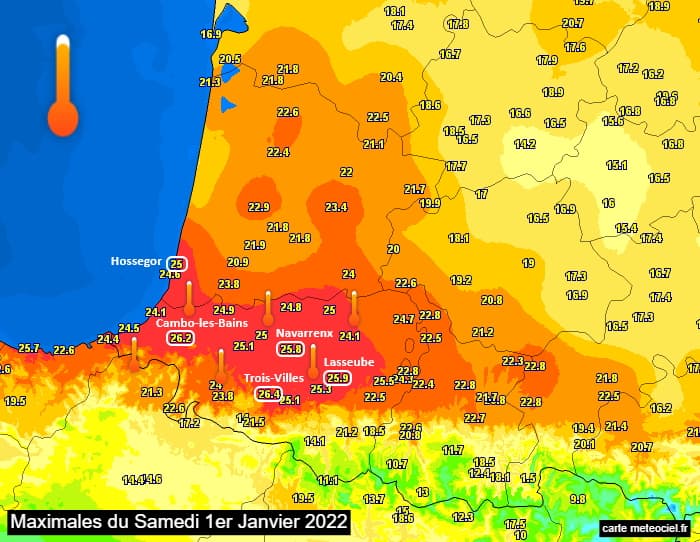 Au cours de cette vague de douceur remarquable, c'est en après-midi du samedi 1er janvier 2022 que les températures ont atteint les niveaux les plus élevés dans le sud-ouest. Le seuil de chaleur (25°C) a été atteint dès le premier jour de l'année avec jusqu'à 26,4°C à Trois-Villes (64) ! Dans les Pyrénées-Atlantiques, Cambo-les-Bains a battu son record de chaleur de janvier avec 26,2°C. Même chose à Hossegor sur le littoral des Landes avec 25°C !
