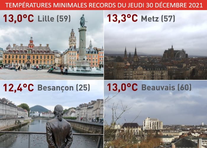 Si de nombreux records diurnes ont été battus, des records nocturnes sont également tombés. Ce fut notamment le cas sur la moitié nord dans la nuit du 29 au 30 décembre 2021. Sous la grisaille et une advection douce remarquable, les températures se sont maintenues entre 12 et 14°C toute la nuit, du jamais vu à cette saison ! Besançon (12,4°C), Beauvais & Lille (13,0°C), Metz & Saint-Quentin (13,3°C) ou encore Amiens (13,9°C) n'avaient jamais connu une nuit de décembre aussi douce !