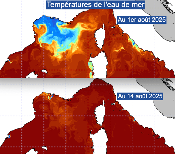 Comparatif des températures de l'eau de mer méditerranéenne entre le 1er et le 14 août 2025 – IFREMER