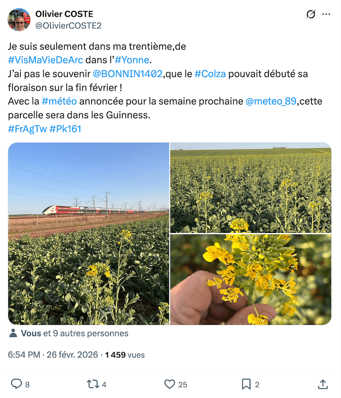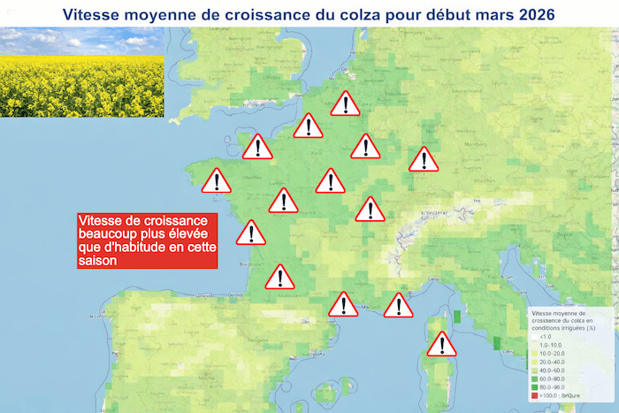 Vitesse moyenne de croissance du colza pour le début du mois de mars 2026 - carte Agro-climat diffusée par Dr. Serge Zaka @SergeZakahttps://x.com/SergeZakaÂ