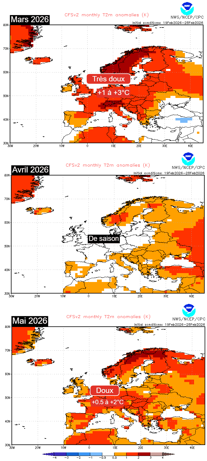 Enfin, la douceur printanière devrait de nouveau s'affirmer plus franchement durant le mois de mai selon le modèle américain CFS. Les premières chaleurs estivales pourraient même arriver de façon précoce à la vue des anomalies de températures envisagées pour ce mois (+1 à +2°C au-dessus des normales en général).