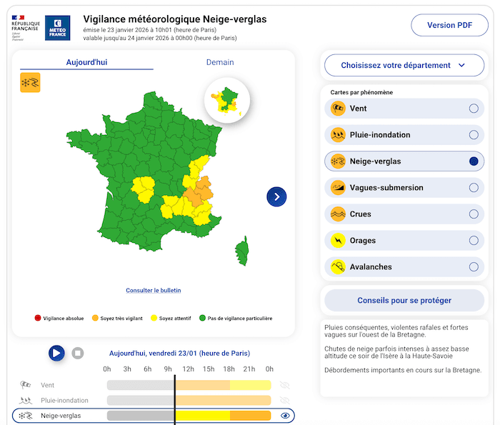 En fin d’après-midi et début de soirée, la tempête Ingrid devrait provoquer des chutes de neige importantes à relativement basse altitude dans les départements alpins.  Une augmentation du niveau de vigilance pour le paramètre « neige-verglas » est envisageable pour l’Ain et la Drôme. Le passage en vigilance orange est lié à l'effet d'isothermie qui pourrait faire baisser le niveau des chutes de neige, jusqu'en plaine et sur les autoroutes fréquentées des vallées alpines avec un fort trafic en au retour du travail. Le nord Isère, ainsi que les vallées de Chambéry et notamment Annecy seront particulièrement exposées.