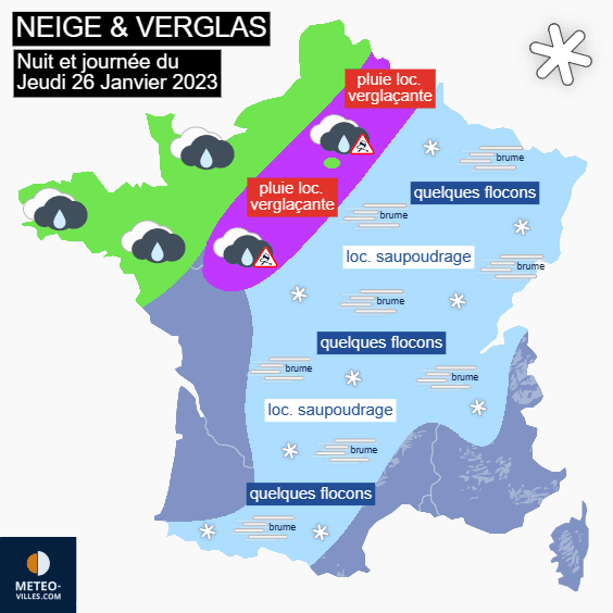 Prévision du risque de neige et de verglas pour la nuit et la journée du jeudi 26 janvier 2023 - Météo Villes
