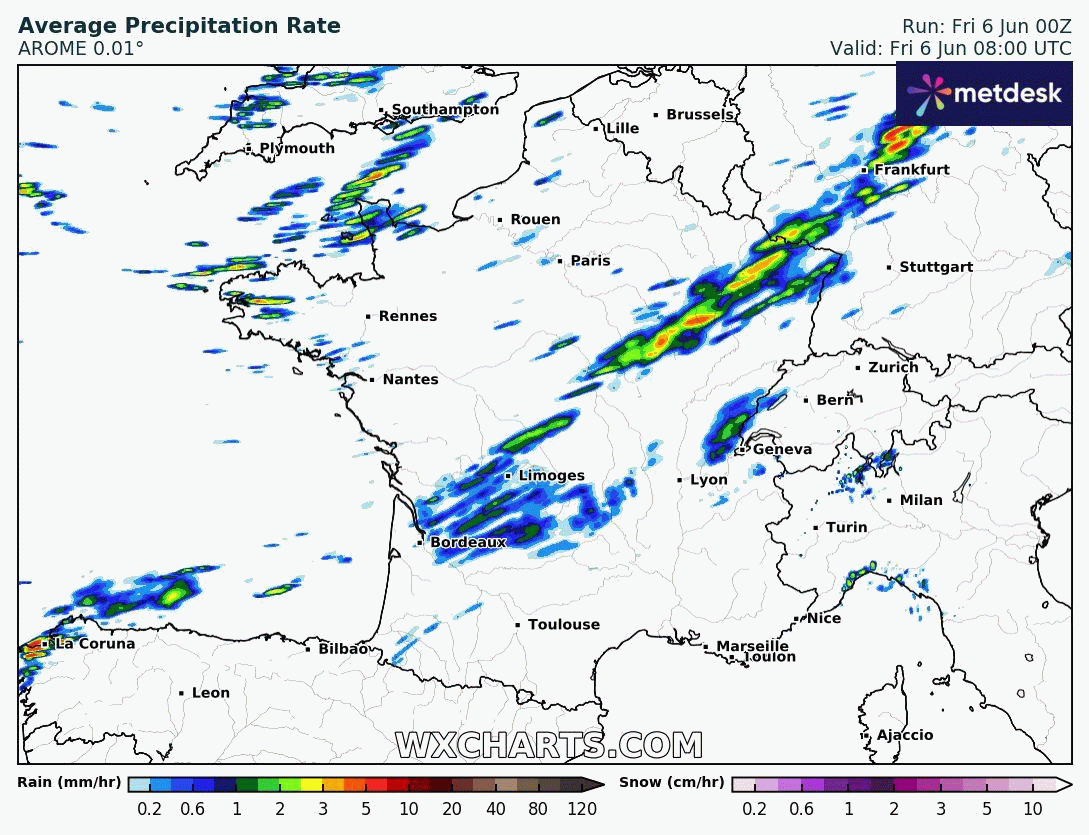 Animation du risque de précipitations sur la France du vendredi 6 au samedi 7 juin 2025 – Modèle arome via WX CHARTS