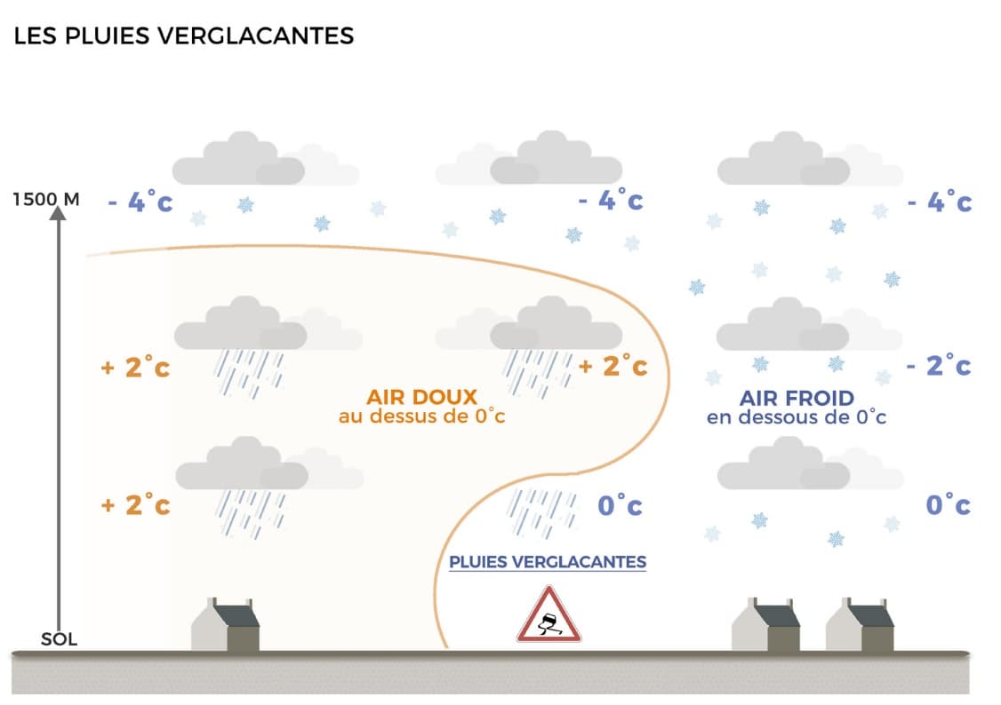 Néanmoins, il peut arriver que la température soit négative près du sol mais qu'une couche d'air plus doux circule en altitude. Dans cette situation les flocons se formant au sommet des nuages fondent en traversant la couche plus douce de l’atmosphère, puis les gouttelettes d’eau formées entrent en surfusion en pénétrant la couche d’air froid près du sol et gèlent au contact du moindre point de congélation (corps dont la température est inférieure ou égale à 0°C).