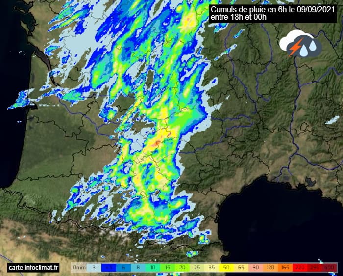 Cumuls de pluie sur 6h au sud-ouest le jeudi 9 septembre 2021 entre 18h et 00h - via infoclimat.fr