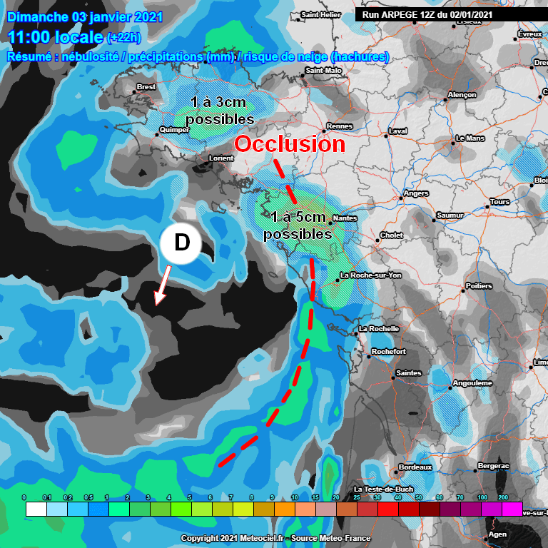 Un second minimum dépressionnaire va glisser en journée de dimanche de la Manche aux côtes Atlantiques. Une occlusion devrait s'opérer entre la Loire-Atlantique et la Vendée en cours de matinée avec de probables chutes de neige sur ces régions. Celles-ci pourraient apporter plusieurs centimètres dans l'intérieur des terres entre la région de Saint-Nazaire et La Rochelle ainsi que sur les reliefs bretons avant de s'évacuer en cours d'après-midi vers le Sud, touchant possiblement les Charentes et le Nord de l'estuaire de la Gironde.